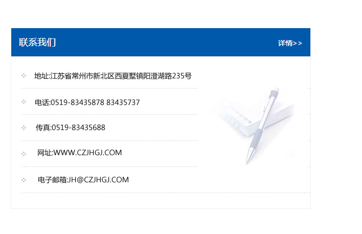 傳真:0519-83435688    郵編:213135    網址:WWW.czjhgj_com.txtlmidia.com    電子郵箱:JH@czjhgj_com.txtlmidia.com